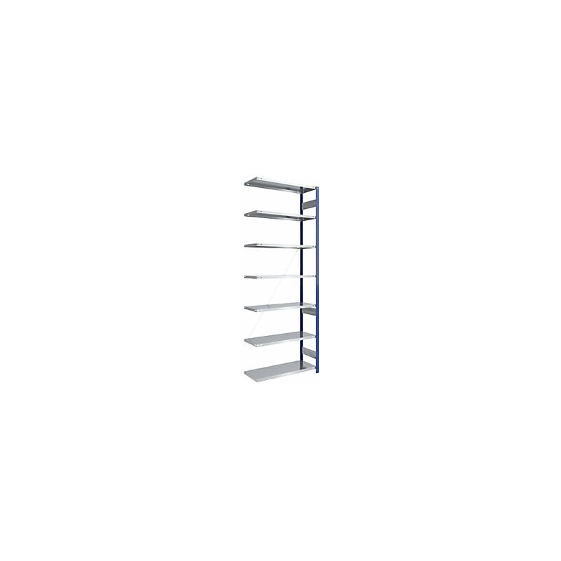 Scaffale a innesto per magazzino, montanti blu, ripiano zincato, alt. x largh. 3000 x 1000 mm, scaffale aggiuntivo, profondità 500 mm. Fornitura = smontato. Tipo di scaffale = scaffale aggiuntivo. Numero ripiani = 7 pz. Profondità ripiani = 500 mm. Portata ripiani = 140 kg. Altezza scaffale = 3000 mm. Larghezza totale = 1010 mm. Portata campata = 1700 kg. Struttura = a innesto. Colore montanti = blu genziana RAL 5010. Larghezza ripiani = 1000 mm. Profondità totale = 535 mm. Materiale = acciaio. Passo di regolazione altezza ripiani = 25 mm. Colore ripiani = zincatura. Superficie ripiano = zincatura. Versione di scaffale = un lato utile. Gradevoli colori. Sfruttamento ottimale dello spazio. Ripiani di portata molto elevata per diversi tipi di merce. Semplice montaggio a innesto. Montanti Accuratamente plastificati, blu genziana RAL 5010. Piedini zincati. Ripiani Zincati e plastificati in grigio chiaro RAL 7035. Sponde alte 40 mm. Piastre di connessione zincate. Ripiani anteriori e