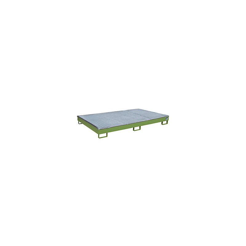 Vasca di raccolta per scaffali con inserto in PE, con griglia, 240 l, lungh. x largh. x alt. 2165 x 1315 x 230 mm, verde. Fornitura = montato. Capacità di raccolta = 240 l. Lunghezza = 2165 mm. Larghezza = 1315 mm. Altezza = 230 mm. Materiale = lamiera d'acciaio, polietilene. Superficie = verniciatura. Colore = verde reseda RAL 6011. Versione vasca di raccolta = con inserto in PE. Portata = 1000 kg/m². Altezza entrate forche = 100 mm. Marchio di collaudo = ÜHP secondo la direttiva StawaR. Spessore materiale = 3 mm. Per sostanze = liquidi aggressivi e infiammabili, sostanze inquinanti per le acque. Classi di pericolosità = per liquidi infiammabili delle categorie GHS 1 - 3, per liquidi inquinanti per le acque delle categorie GHS 1 - 4 e per liquidi corrosivi della categoria GHS 1. Carico distribuito = 1000 kg/m². Per lo stoccaggio di sostanze aggressive, corrosive e infiammabili in taniche su palette - la griglia per vasca può essere utilizzata come ripiano di stoccaggio inferiore.