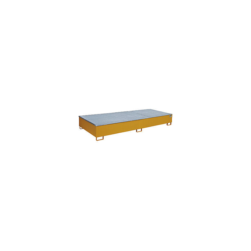 Vasca di raccolta per scaffali con inserto in PE, con griglia, 1000 l, lungh. x largh. x alt. 3265 x 1315 x 385 mm, arancione. Fornitura = montato. Capacità di raccolta = 1000 l. Lunghezza = 3265 mm. Larghezza = 1315 mm. Altezza = 385 mm. Materiale = lamiera d'acciaio, polietilene. Superficie = verniciatura. Colore = arancione RAL 2000. Versione vasca di raccolta = con inserto in PE. Portata = 1000 kg/m². Altezza entrate forche = 100 mm. Marchio di collaudo = ÜHP secondo la direttiva StawaR. Spessore materiale = 3 mm. Per sostanze = liquidi aggressivi e infiammabili, sostanze inquinanti per le acque. Classi di pericolosità = per liquidi infiammabili delle categorie GHS 1 - 3, per liquidi inquinanti per le acque delle categorie GHS 1 - 4 e per liquidi corrosivi della categoria GHS 1. Carico distribuito = 1000 kg/m². Per lo stoccaggio di sostanze aggressive, corrosive e infiammabili in taniche su palette - la griglia per vasca può essere utilizzata come ripiano di stoccaggio inferiore.