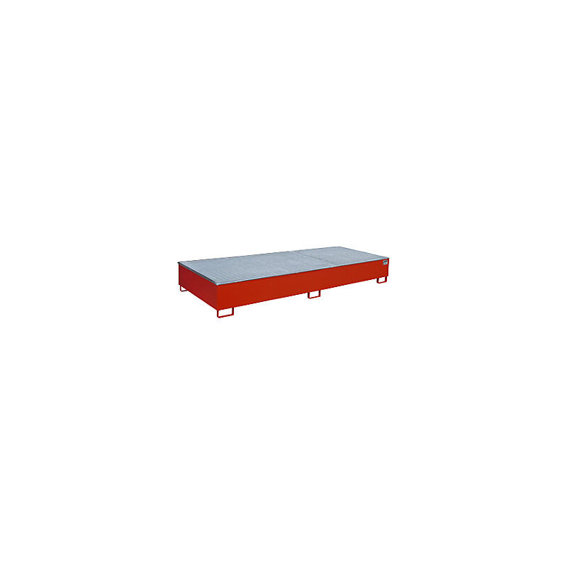 Vasca di raccolta per scaffali con inserto in PE, con griglia, 1000 l, lungh. x largh. x alt. 3265 x 1315 x 385 mm, rosso. Fornitura = montato. Capacità di raccolta = 1000 l. Lunghezza = 3265 mm. Larghezza = 1315 mm. Altezza = 385 mm. Materiale = lamiera d'acciaio, polietilene. Superficie = verniciatura. Colore = rosso fuoco RAL 3000. Versione vasca di raccolta = con inserto in PE. Portata = 1000 kg/m². Altezza entrate forche = 100 mm. Marchio di collaudo = ÜHP secondo la direttiva StawaR. Spessore materiale = 3 mm. Per sostanze = liquidi aggressivi e infiammabili, sostanze inquinanti per le acque. Classi di pericolosità = per liquidi infiammabili delle categorie GHS 1 - 3, per liquidi inquinanti per le acque delle categorie GHS 1 - 4 e per liquidi corrosivi della categoria GHS 1. Carico distribuito = 1000 kg/m². Per lo stoccaggio di sostanze aggressive, corrosive e infiammabili in taniche su palette - la griglia per vasca può essere utilizzata come ripiano di stoccaggio inferiore.