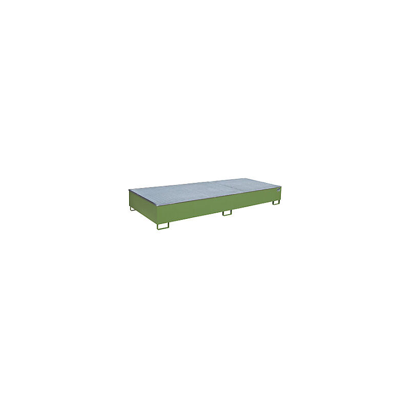 Vasca di raccolta per scaffali con inserto in PE, con griglia, 1000 l, lungh. x largh. x alt. 3265 x 1315 x 385 mm, verde. Fornitura = montato. Capacità di raccolta = 1000 l. Lunghezza = 3265 mm. Larghezza = 1315 mm. Altezza = 385 mm. Materiale = lamiera d'acciaio, polietilene. Superficie = verniciatura. Colore = verde reseda RAL 6011. Versione vasca di raccolta = con inserto in PE. Portata = 1000 kg/m². Altezza entrate forche = 100 mm. Marchio di collaudo = ÜHP secondo la direttiva StawaR. Spessore materiale = 3 mm. Per sostanze = liquidi aggressivi e infiammabili, sostanze inquinanti per le acque. Classi di pericolosità = per liquidi infiammabili delle categorie GHS 1 - 3, per liquidi inquinanti per le acque delle categorie GHS 1 - 4 e per liquidi corrosivi della categoria GHS 1. Carico distribuito = 1000 kg/m². Per lo stoccaggio di sostanze aggressive, corrosive e infiammabili in taniche su palette - la griglia per vasca può essere utilizzata come ripiano di stoccaggio inferiore.