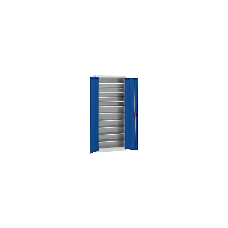 Armadio portamateriale in lamiera d'acciaio, altezza 1575 mm, grigio chiaro RAL 7035/blu genziana RAL 5010, 11 ripiani. Fornitura = montato. Altezza = 1575 mm. Larghezza = 670 mm. Profondità = 260 mm. Materiale corpo = lamiera d'acciaio. Materiale porta = lamiera d'acciaio. Superficie = verniciatura a polvere. Materiale ripiani = lamiera d'acciaio, zincata. Colore corpo = grigio chiaro RAL 7035. Colore porta = blu genziana RAL 5010. Portata per ripiano = 30 kg. Numero ripiani = 11 pz. Passo di regolazione altezza ripiani = 16 mm. Tipo di porta = anta a battente. Tre altezze, medesima larghezza e profondità. Verniciatura a polvere ecologica. Per cassettine in polipropilene di alta qualità. Corpo Robusta e resistente struttura in acciaio. Verniciatura a polvere ecologica e antiabrasione. Ante Con cerniere esterne, maniglia girevole e serratura di sicurezza. Chiusura con chiavistello. Verniciatura a polvere ecologica e antiabrasione. Ripiani Zincati, regolabili con passo di 16 mm.