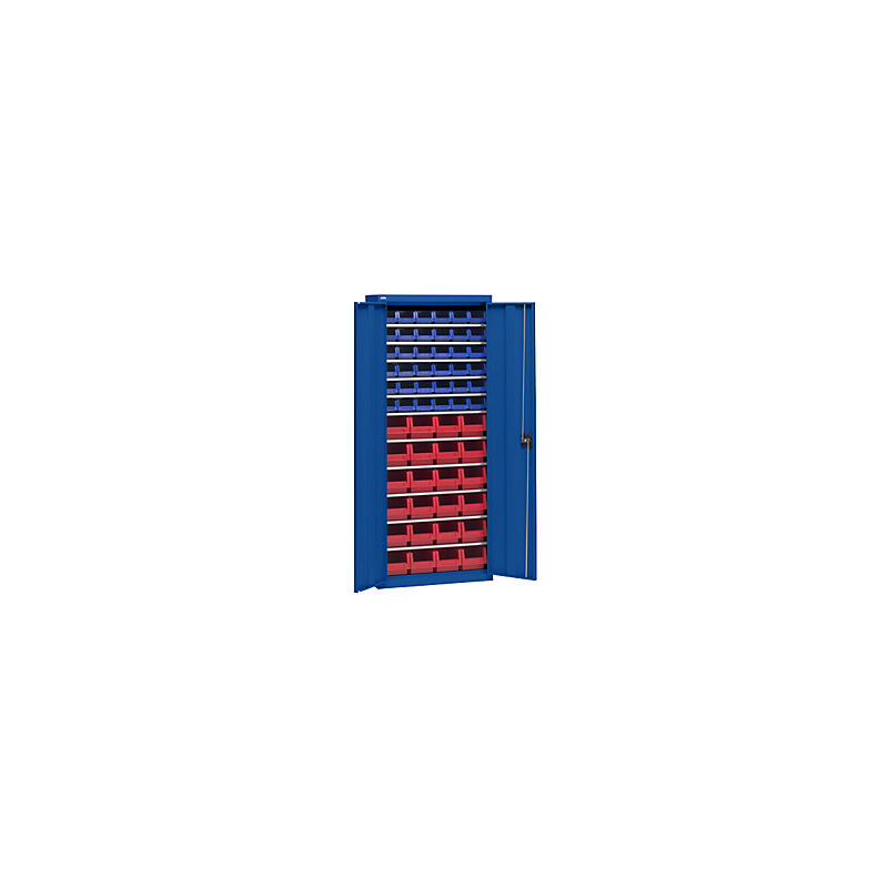 Armadio portamateriale con cassettine, altezza 1575 mm, 11 ripiani, blu genziana. Fornitura = montato. Altezza = 1575 mm. Larghezza = 670 mm. Profondità = 260 mm. Materiale = lamiera d'acciaio. Superficie = verniciatura a polvere. Portata totale = 300 kg. Numero ripiani = 11 pz. Materiale ripiani = lamiera d'acciaio, zincata. Portata per ripiano = 30 kg. Passo di regolazione altezza ripiani = 16 mm. Cassettine numero / lungh. x largh. x alt. = 36 x blu / 164x105x75 mm, 24 x rosso / 230x150x125 mm. Materiale cassettine modulari = polipropilene. Colore corpo = blu genziana RAL 5010. Colore porta = blu genziana RAL 5010. Tipo di porta = anta a battente. Serratura = maniglia girevole e serratura di sicurezza con doppio chiavistello. Numero cassette = 60 pz. Peso = 55.25 kg. In tre altezze. Cassettine in colori assortiti in polipropilene di alta qualità. Verniciatura a polvere antiabrasione ed ecologica. Corpo Robusta e resistente struttura in acciaio. Verniciatura a polvere ecologica e