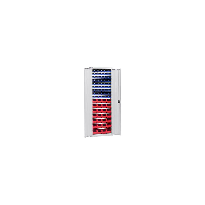 Armadio portamateriale con cassettine, altezza 2000 mm, 15 ripiani, grigio chiaro. Fornitura = montato. Altezza = 2000 mm. Larghezza = 670 mm. Profondità = 260 mm. Materiale = lamiera d'acciaio. Superficie = verniciatura a polvere. Portata totale = 380 kg. Numero ripiani = 15 pz. Materiale ripiani = lamiera d'acciaio, zincata. Portata per ripiano = 30 kg. Passo di regolazione altezza ripiani = 16 mm. Cassettine numero / lungh. x largh. x alt. = 54 x blu / 164x105x75 mm, 28 x rosso / 230x150x125 mm. Materiale cassettine modulari = polipropilene. Colore corpo = grigio chiaro RAL 7035. Colore porta = grigio chiaro RAL 7035. Tipo di porta = anta a battente. Serratura = maniglia girevole e serratura di sicurezza con doppio chiavistello. Numero cassette = 82 pz. Peso = 70.76 kg. In tre altezze. Cassettine in colori assortiti in polipropilene di alta qualità. Verniciatura a polvere antiabrasione ed ecologica. Corpo Robusta e resistente struttura in acciaio. Verniciatura a polvere ecologica