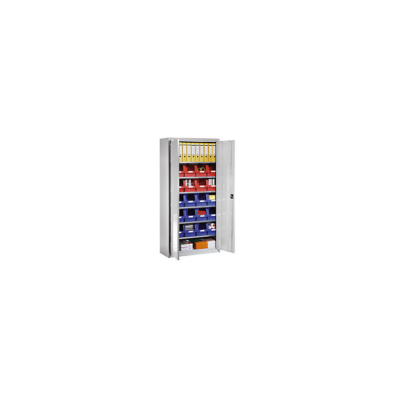 Armadio magazzino in lamiera d'acciaio, con 20 cassettine, grigio chiaro RAL 7035. Fornitura = montato. Altezza = 1950 mm. Larghezza = 950 mm. Profondità = 400 mm. Materiale = lamiera d'acciaio. Superficie = verniciatura a polvere. Portata totale = 360 kg. Numero ripiani = 6 pz. Materiale ripiani = lamiera d'acciaio, zincata. Portata per ripiano = 60 kg. Passo di regolazione altezza ripiani = 25 mm. Cassettine numero / lungh. x largh. x alt. = 12 x blu / 330x213x150 mm, 8 x rosso / 330x213x150 mm. Materiale cassettine modulari = polipropilene. Colore corpo = grigio chiaro RAL 7035. Colore porta = grigio chiaro RAL 7035. Tipo di porta = anta a battente. Serratura = maniglia girevole e serratura di sicurezza con doppio chiavistello. Numero cassette = 20 pz. Peso = 85.06 kg. Cassettine in colori assortiti in polipropilene di alta qualità. Con sei ripiani regolabili in altezza. Corpo Robusta e resistente struttura in acciaio. Verniciatura a polvere ecologica e antiabrasione. Ante