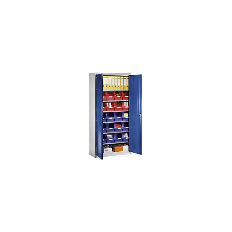 Armadio magazzino in lamiera d'acciaio, con 20 cassettine, grigio chiaro RAL 7035/blu genziana RAL 5010. Fornitura = montato. Altezza = 1950 mm. Larghezza = 950 mm. Profondità = 400 mm. Materiale = lamiera d'acciaio. Superficie = verniciatura a polvere. Portata totale = 360 kg. Numero ripiani = 6 pz. Materiale ripiani = lamiera d'acciaio, zincata. Portata per ripiano = 60 kg. Passo di regolazione altezza ripiani = 25 mm. Cassettine numero / lungh. x largh. x alt. = 12 x blu / 330x213x150 mm, 8 x rosso / 330x213x150 mm. Materiale cassettine modulari = polipropilene. Colore corpo = grigio chiaro RAL 7035. Colore porta = blu genziana RAL 5010. Tipo di porta = anta a battente. Serratura = maniglia girevole e serratura di sicurezza con doppio chiavistello. Numero cassette = 20 pz. Peso = 85.06 kg. Cassettine in colori assortiti in polipropilene di alta qualità. Con sei ripiani regolabili in altezza. Corpo Robusta e resistente struttura in acciaio. Verniciatura a polvere ecologica e