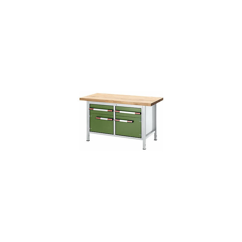 Banco da lavoro regolabile in altezza, struttura modulare, 2 cassetti, 2 ante, larghezza 1500 mm, grigio chiaro / verde. Fornitura = montato. Larghezza piano = 1500 mm. Profondità piano = 700 mm. Tipo di piano = piano in faggio massello. Spessore piano = 40 mm. Altezza cassetti = 2x180 mm. Altezza = 1040 mm. Colore frontalino = verde reseda RAL 6011. Versione cassetti = guida telescopica su cuscinetti a sfera. Campo di regolazione altezza = 840 - 1040 mm. Portata per cassetto = 100 kg. Estrazione cassetti = 100%. Larghezza cassetti = 490 mm. Profondità cassetti = 560 mm. Materiale telaio = acciaio, verniciato a polvere. Numero ante = 2 pz. Altezza porta = 360 mm. Portata statica = 1250 kg. Versione telaio = tubo a sezione quadra 45x45 mm. Colore telaio = grigio chiaro RAL 7035. Serratura = chiusura centralizzata a cilindro. Impiego: industria, officina, reparti produzione e montaggio ecc. Piano di lavoro in faggio massello non soggetto a deformazioni, spesso 40 mm. Robusta struttura