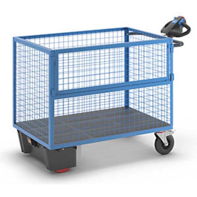 Carrello a cassone con azionamento elettrico, pareti in reticolare d'acciaio, senza coperchio, lungh. x largh. x alt. 1620 x 820 x 1200 mm. Fornitura = in parte smontato. Portata = 500 kg. Lunghezza = 1620 mm. Larghezza = 820 mm. Altezza = 1200 mm. Lunghezza interna = 1228 mm. Larghezza interna = 778 mm. Altezza interna = 785 mm. Altezza di riempimento = 800 mm. Capacità = 750 l. Versione = struttura con angolari d'acciaio, una sponda lunga a mezza ribalta. Materiale parete = griglia d'acciaio. Ripiano di base = plastica riciclata. Superficie = verniciatura a polvere. Colore = blu chiaro RAL 5012. Versione ruote = gomma piena / poliuretano. Dotazione ruote = 2 rotelle pivottanti con fermo, 2 ruote motrici. Diametro ruote = 200 / 230 mm. Cuscinetti ruota = cuscinetto a rulli. Capacità della batteria = 12 Ah. Durata di carica = 6 ore. Potenza = 0,25 kW. Tensione = 24 V. Velocità max = 5 km/h. Tipo di prodotto = carrelli a cassone con azionamento elettrico. Altamente versatili grazie alla