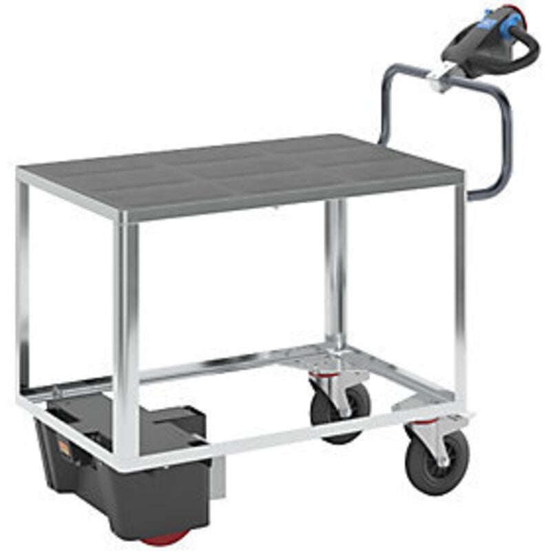 Carrello di montaggio con azionamento elettrico, 1 ripiano in plastica, lungh. x largh. x alt. 1470 x 700 x 1300 mm, con zincatura. Fornitura = in parte smontato. Numero piani = 1 pz. Lunghezza superficie di carico = 1050 mm. Larghezza superficie di carico = 700 mm. Colore = zincatura elettrolitica. Materiale superficie di carico = plastica. Altezza di lavoro = 910 m. Portata = 500 kg. Altezza ripiani = 290 / 910 mm. Lunghezza = 1470 mm. Larghezza = 700 mm. Altezza = 1300 mm. Tipo di prodotto = carrelli di montaggio con azionamento elettrico. Dotazione ruote = 2 rotelle pivottanti con fermo, 2 ruote motrici. Versione ruote = gomma piena / poliuretano. Diametro ruote = Ø200 / Ø230 mm. Cuscinetti ruota = cuscinetto a rulli. Altamente versatili grazie alla struttura modulare. Funzionamento illimitato grazie alle batterie sostituibili. Funzionamento intuitivo, pratico sistema di guida. Testa del timone con velocità regolabile in modo preciso, pulsante di velocità di scorrimento, pulsante