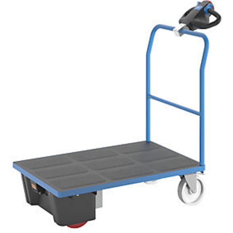 Carrello a pianale con azionamento elettrico, impugnatura tubolare, lungh. x largh. x alt. 1370 x 700 x 1300 mm, ruote in poliammide. Fornitura = in parte smontato. Portata = 500 kg. Dotazione = con impugnatura tubolare. Lunghezza superficie di carico = 1010 mm. Larghezza superficie di carico = 700 mm. Altezza di carico = 285 mm. Lunghezza = 1370 mm. Larghezza = 700 mm. Altezza = 1300 mm. Altezza impugnatura = 1130 mm. Colore telaio = blu chiaro RAL 5012. Versione ruote = poliammide / poliuretano. Diametro ruote = 200 / 230 mm. Cuscinetti ruota = cuscinetto a strisciamento. Dotazione ruote = 2 rotelle pivottanti con fermo, 2 ruote motrici. Colore superficie di carico = nero. Peso = 63 kg. Materiale superficie di carico = plastica. Materiale telaio = acciaio. Altamente versatili grazie alla struttura modulare. Funzionamento illimitato grazie alle batterie sostituibili. Funzionamento intuitivo, pratico sistema di guida. Testa del timone con velocità regolabile in modo preciso, pulsante