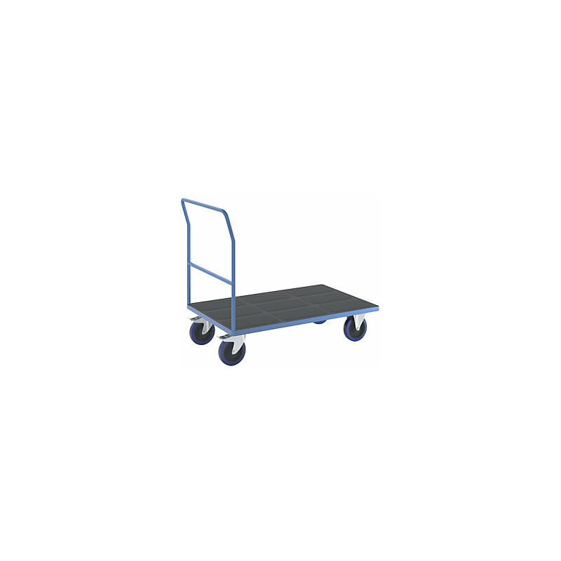 Carrello a pianale con impugnatura, superficie d'appoggio lungh. x largh. 1250 x 800 mm, gomma elastica. Fornitura = preassemblato, montaggio finale a cura del cliente. Lunghezza superficie di carico = 1250 mm. Larghezza superficie di carico = 800 mm. Altezza di carico = 280 mm. Lunghezza = 1300 mm. Larghezza = 800 mm. Altezza = 1100 mm. Altezza impugnatura = 1100 mm. Colore telaio = blu chiaro RAL 5012. Versione ruote = gomma elastica. Diametro ruote = ø200 mm. Cuscinetti ruota = cuscinetto a rulli. Dotazione ruote = 2 rotelle pivottanti con fermo, 2 rotelle a supporto fisso. Colore superficie di carico = nero. Peso = 46.86 kg. Materiale superficie di carico = plastica. Materiale impugnatura = acciaio. Colore impugnatura = blu chiaro RAL 5012. Versione impugnatura = fissato a vite. Materiale telaio = acciaio. Caratteristiche = non rovina il pavimento, usura ridotta, attrito ridotto, ruote a profilo liscio. Bassa resistenza iniziale e all'attrito grazie alle ruote in gomma piena