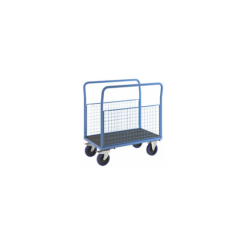 Carrello a pianale con sponde grigliate, superficie d'appoggio lungh. x largh. 1050 x 620 mm, gomma elastica. Fornitura = preassemblato, montaggio finale a cura del cliente. Lunghezza superficie di carico = 1050 mm. Larghezza superficie di carico = 620 mm. Altezza di carico = 280 mm. Lunghezza = 1050 mm. Larghezza = 700 mm. Altezza = 1100 mm. Altezza impugnatura = 1100 mm. Colore telaio = blu chiaro RAL 5012. Versione ruote = gomma elastica. Diametro ruote = ø200 mm. Cuscinetti ruota = cuscinetto a rulli. Dotazione ruote = 2 rotelle pivottanti con fermo, 2 rotelle a supporto fisso. Colore superficie di carico = nero. Peso = 51.76 kg. Materiale superficie di carico = plastica. Materiale impugnatura = acciaio. Colore impugnatura = blu chiaro RAL 5012. Versione impugnatura = fissato a vite. Materiale telaio = acciaio. Caratteristiche = non rovina il pavimento, antitraccia, usura ridotta, attrito ridotto. Bassa resistenza iniziale e all'attrito grazie alle ruote in gomma piena elastica.