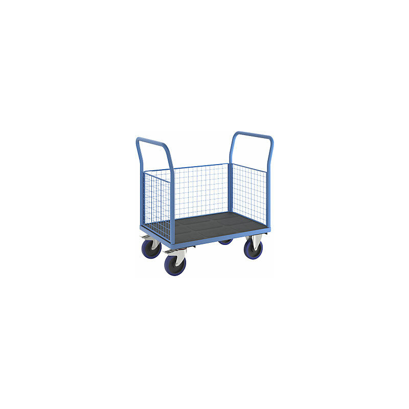 Carrello a pianale con sponde grigliate, superficie d'appoggio lungh. x largh. 1000 x 675 mm, gomma elastica. Fornitura = preassemblato, montaggio finale a cura del cliente. Lunghezza superficie di carico = 1000 mm. Larghezza superficie di carico = 675 mm. Altezza di carico = 280 mm. Lunghezza = 1150 mm. Larghezza = 700 mm. Altezza = 1100 mm. Altezza impugnatura = 1100 mm. Colore telaio = blu chiaro RAL 5012. Versione ruote = gomma elastica. Diametro ruote = ø200 mm. Cuscinetti ruota = cuscinetto a rulli. Dotazione ruote = 2 rotelle pivottanti con fermo, 2 rotelle a supporto fisso. Colore superficie di carico = nero. Peso = 55.96 kg. Materiale superficie di carico = plastica. Materiale impugnatura = acciaio. Colore impugnatura = blu chiaro RAL 5012. Versione impugnatura = fissato a vite. Materiale telaio = acciaio. Bassa resistenza iniziale e all'attrito grazie alle ruote in gomma piena elastica. Pianale resistente all'abrasione in plastica riciclata. I freni di stazionamento