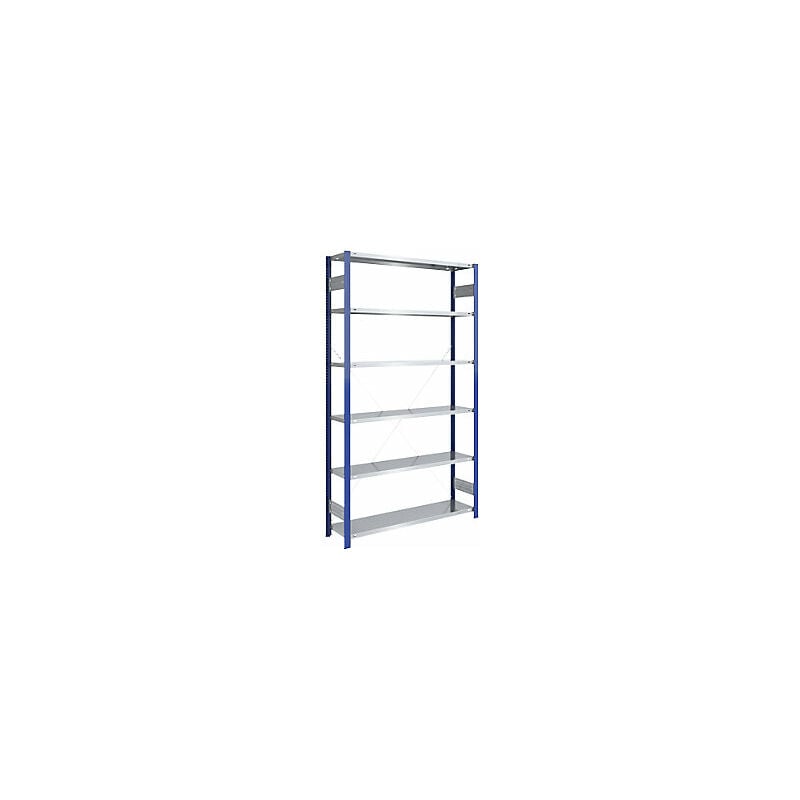 Scaffale a innesto per magazzino, montanti blu, ripiano zincato, alt. x largh. 2500 x 1300 mm, sc. base, profondità 400 mm. Fornitura = smontato. Tipo di scaffale = scaffale portante. Numero ripiani = 6 pz. Profondità ripiani = 400 mm. Portata ripiani = 180 kg. Altezza scaffale = 2500 mm. Larghezza totale = 1360 mm. Portata campata = 1000 kg. Struttura = a innesto. Colore montanti = blu genziana RAL 5010. Larghezza ripiani = 1300 mm. Profondità totale = 435 mm. Materiale = acciaio. Passo di regolazione altezza ripiani = 25 mm. Colore ripiani = zincatura. Superficie ripiano = zincatura. Versione di scaffale = un lato utile. Gradevoli colori. Sfruttamento ottimale dello spazio. Ripiani di portata molto elevata per diversi tipi di merce. Semplice montaggio a innesto. Montanti Accuratamente plastificati, blu genziana RAL 5010. Piedini zincati. Ripiani Zincati e plastificati in grigio chiaro RAL 7035. Sponde alte 40 mm. Piastre di connessione zincate. Ripiani anteriori e posteriori in