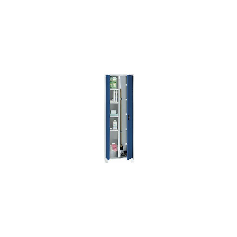 Armadio multiuso e armadio guardaroba, con fermo a clip, 6 scomparti, larghezza 600 mm, corpo in grigio chiaro, ante in blu brillante. Fornitura = montato. Altezza = 1800 mm. Profondità = 500 mm. Larghezza = 600 mm. Colore corpo = grigio chiaro RAL 7035. Colore porta = blu brillante RAL 5007. Serratura = chiavistello girevole di sicurezza per lucchetto. Numero scomparti in larghezza = 2 pz. Numero scomparti = 6 pz. Larghezza scomparti = 300 mm. Materiale = lamiera d'acciaio, saldata a punti. Altezza armadietto = 1695 mm. Dotazione interna = 4 ripiani a sinistra, 4 supporti di fissaggio a destra. Tipo di porta = anta a battente. Altezza scomparti = 4x280 / 1x570 / 1x1695 mm. Larghezza ripiani = 300 mm. Struttura = saldata a punti. Superficie = con verniciatura a forno. Con chiavistello girevole di sicurezza: da chiusa, la serratura può essere ruotata di 360°, contro i tentativi di apertura forzata. Finecorsa di apertura a 100° integrato. Aerazione mediante fori sulle ante e sulla parete