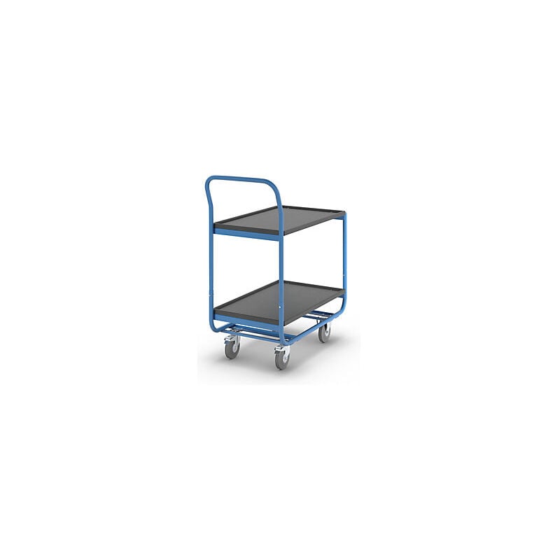 Carrello di servizio, portata 150 kg, pianali con bordino anticaduta, 2 pianali. Fornitura = smontato. Materiale superficie di carico = piano in MDF, verniciato. Larghezza superficie di carico = 470 mm. Lunghezza superficie di carico = 770 mm. Materiale telaio = tubo d'acciaio, verniciato a polvere. Colore = blu chiaro RAL 5012, nero. Versione ruote = gomma piena antitraccia. Altezza = 1115 mm. Dotazione ruote = 2 ruote sterzanti con fermo doppio, 2 rotelle a supporto fisso. Diametro ruote = 125 mm. Cuscinetti ruota = cuscinetto a rulli. Numero piani = 2 pz. Altezza ripiani = 300 / 800 mm. Perfetti per lo smistamento. Ottimi per lavori di montaggio. Ideali per il trasporto delle merci. Molto versatili in magazzini, reparti di produzione e di spedizione. Superficie di carico in MDF nero e telaio con verniciatura a polvere di qualità in blu chiaro RAL 5012. 2 rotelle pivottanti con fermo doppio e 2 rotelle a supporto fisso, cuscinetti a rulli. Pianali con bordino anticaduta alto 15 mm su