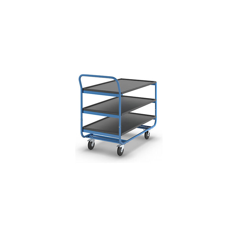 Carrello di servizio, portata 150 kg, 3 pianali con bordino anticaduta, ruote in gomma piena, antitraccia. Fornitura = smontato. Materiale superficie di carico = piano in MDF, verniciato. Larghezza superficie di carico = 570 mm. Lunghezza superficie di carico = 1000 mm. Materiale telaio = tubo d'acciaio, verniciato a polvere. Colore = blu chiaro RAL 5012, nero. Versione ruote = gomma piena antitraccia. Altezza = 1115 mm. Dotazione ruote = 2 ruote sterzanti con fermo doppio, 2 rotelle a supporto fisso. Diametro ruote = 125 mm. Cuscinetti ruota = cuscinetto a rulli. Numero piani = 3 pz. Altezza ripiani = 300 / 550 / 800 mm. Modello largo. Perfetti per lo smistamento. Ottimi per lavori di montaggio. Ideali per il trasporto delle merci. Molto versatili in magazzini, reparti di produzione e di spedizione. Superficie di carico in MDF nero e telaio con verniciatura a polvere di qualità in blu chiaro RAL 5012. 2 rotelle pivottanti con fermo doppio e 2 rotelle a supporto fisso, cuscinetti a