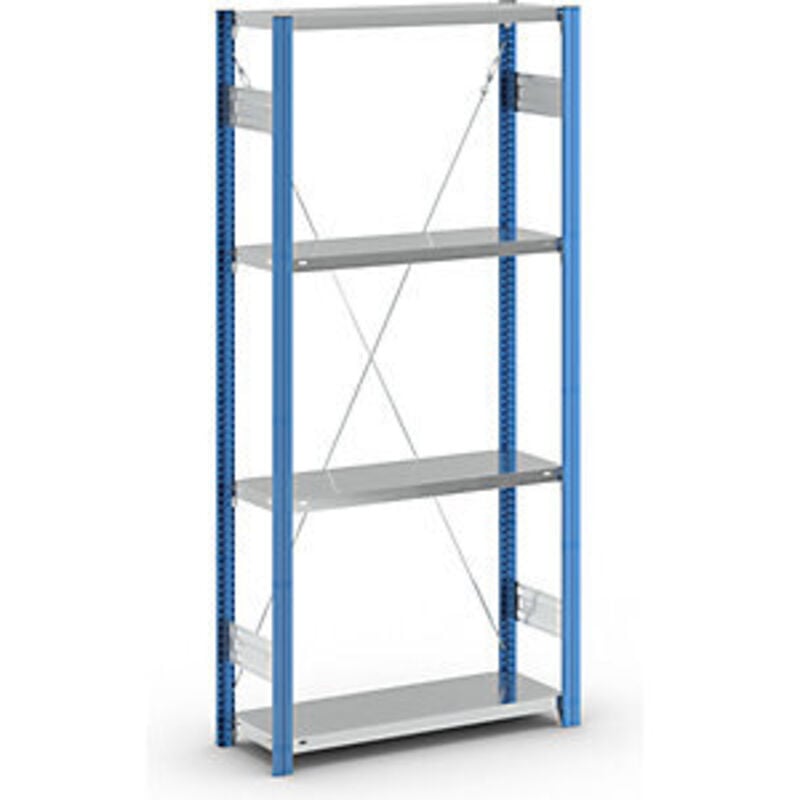Scaffale a innesto a ripiani, blu / zincato, altezza scaffale 2000 mm, larghezza ripiano 965 mm, scaffale portante, profondità ripiano 350 mm. Fornitura = smontato. Tipo di scaffale = scaffale portante. Numero ripiani = 4 pz. Profondità ripiani = 350 mm. Portata ripiani = 150 kg. Altezza scaffale = 2000 mm. Larghezza totale = 1025 mm. Portata campata = 1600 kg. Struttura = a innesto. Colore montanti = blu chiaro RAL 5012. Larghezza ripiani = 965 mm. Profondità totale = 385 mm. Superficie = zincatura e verniciatura plastica. Passo di regolazione altezza ripiani = 25 mm. Colore ripiani = zincatura. Robusto scaffale a innesto con ripiani zincati. Facile montaggio a innesto. Possibilità di combinare elementi di base e aggiuntivi. Numero variabile di ripiani e di profondità del fondo. Configurazione in base al carico. Montaggio a pavimento incluso nella fornitura. Nel tuo magazzino, in officina e in fabbrica: affidati a questo scaffale senza bulloni estremamente stabile in acciaio con