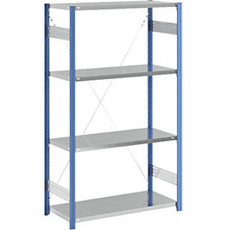 Scaffale a innesto a ripiani, blu / zincato, altezza scaffale 2000 mm, larghezza ripiano 1215 mm, scaffale portante, profondità ripiano 550 mm. Fornitura = smontato. Tipo di scaffale = scaffale portante. Numero ripiani = 4 pz. Profondità ripiani = 550 mm. Portata ripiani = 190 kg. Altezza scaffale = 2000 mm. Larghezza totale = 1275 mm. Portata campata = 1600 kg. Struttura = a innesto. Colore montanti = blu chiaro RAL 5012. Larghezza ripiani = 1215 mm. Profondità totale = 585 mm. Superficie = zincatura e verniciatura plastica. Passo di regolazione altezza ripiani = 25 mm. Colore ripiani = zincatura. Robusto scaffale a innesto con ripiani zincati. Facile montaggio a innesto. Possibilità di combinare elementi di base e aggiuntivi. Numero variabile di ripiani e di profondità del fondo. Configurazione in base al carico. Montaggio a pavimento incluso nella fornitura. Nel tuo magazzino, in officina e in fabbrica: affidati a questo scaffale senza bulloni estremamente stabile in acciaio con