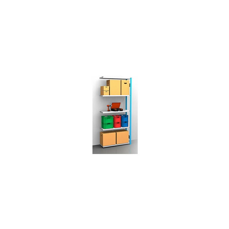 Scaffale a innesto a ripiani, blu / zincato, altezza scaffale 2350 mm, larghezza ripiano 965 mm, scaffale aggiuntivo, profondità ripiano 350 mm. Fornitura = smontato. Tipo di scaffale = scaffale aggiuntivo. Numero ripiani = 5 pz. Profondità ripiani = 350 mm. Portata ripiani = 150 kg. Altezza scaffale = 2350 mm. Larghezza totale = 975 mm. Portata campata = 1000 kg. Struttura = a innesto. Colore montanti = blu chiaro RAL 5012. Larghezza ripiani = 965 mm. Profondità totale = 385 mm. Superficie = zincatura e verniciatura plastica. Passo di regolazione altezza ripiani = 25 mm. Colore ripiani = zincatura. Robusto scaffale a innesto con ripiani zincati. Facile montaggio a innesto. Possibilità di combinare elementi di base e aggiuntivi. Numero variabile di ripiani e di profondità del fondo. Configurazione in base al carico. Montaggio a pavimento incluso nella fornitura. Nel tuo magazzino, in officina e in fabbrica: affidati a questo scaffale senza bulloni estremamente stabile in acciaio con