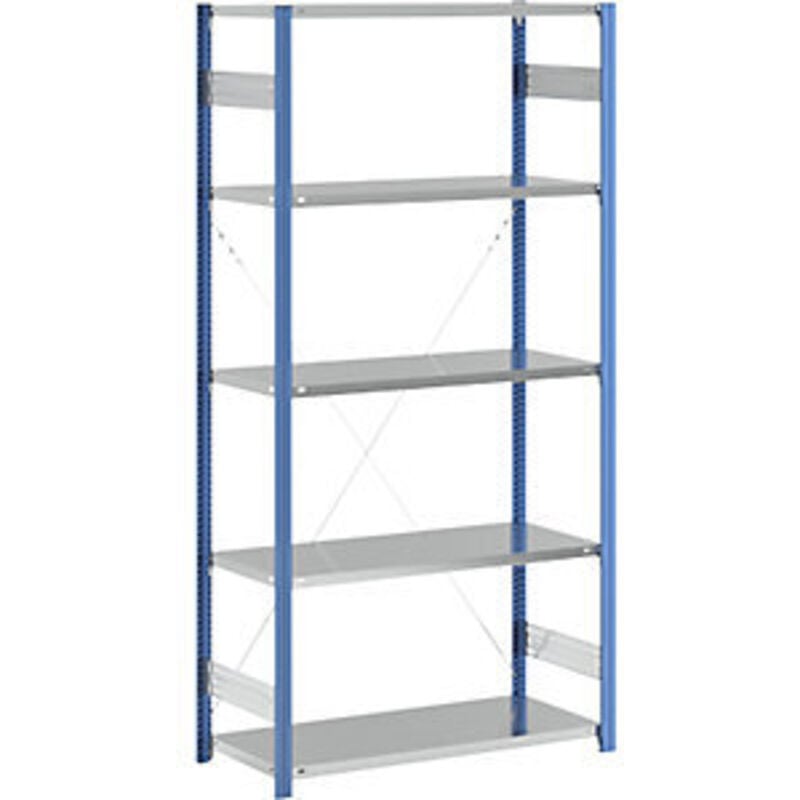 Scaffale a innesto a ripiani, blu / zincato, altezza scaffale 2350 mm, larghezza ripiano 1215 mm, scaffale portante, profondità ripiano 550 mm. Fornitura = smontato. Tipo di scaffale = scaffale portante. Numero ripiani = 5 pz. Profondità ripiani = 550 mm. Portata ripiani = 190 kg. Altezza scaffale = 2350 mm. Larghezza totale = 1275 mm. Portata campata = 1000 kg. Struttura = a innesto. Colore montanti = blu chiaro RAL 5012. Larghezza ripiani = 1215 mm. Profondità totale = 585 mm. Superficie = zincatura e verniciatura plastica. Passo di regolazione altezza ripiani = 25 mm. Colore ripiani = zincatura. Robusto scaffale a innesto con ripiani zincati. Facile montaggio a innesto. Possibilità di combinare elementi di base e aggiuntivi. Numero variabile di ripiani e di profondità del fondo. Configurazione in base al carico. Montaggio a pavimento incluso nella fornitura. Nel tuo magazzino, in officina e in fabbrica: affidati a questo scaffale senza bulloni estremamente stabile in acciaio con