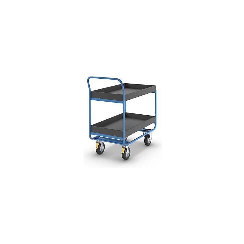 Carrello di servizio, portata 150 kg, 2 pianali con alzatina, ruote con camera d'aria. Fornitura = smontato. Materiale superficie di carico = piano in MDF, verniciato. Larghezza superficie di carico = 580 mm. Lunghezza superficie di carico = 1010 mm. Materiale telaio = tubo d'acciaio, verniciato a polvere. Colore = blu chiaro RAL 5012, nero. Versione ruote = ruote con camera d'aria. Altezza = 1190 mm. Dotazione ruote = 2 ruote sterzanti con fermo doppio, 2 rotelle a supporto fisso. Diametro ruote = 200 mm. Cuscinetti ruota = cuscinetto a rulli. Numero piani = 2 pz. Altezza ripiani = 300 / 800 mm. Versione pianale = sponde di carico alte 75 mm. Modello largo. Perfetti per lo smistamento. Ottimi per lavori di montaggio. Ideali per il trasporto delle merci. Molto versatili in magazzini, reparti di produzione e di spedizione. Superficie di carico in MDF nero e telaio con verniciatura a polvere di qualità in blu chiaro RAL 5012. 2 rotelle pivottanti con fermo doppio e 2 rotelle a supporto
