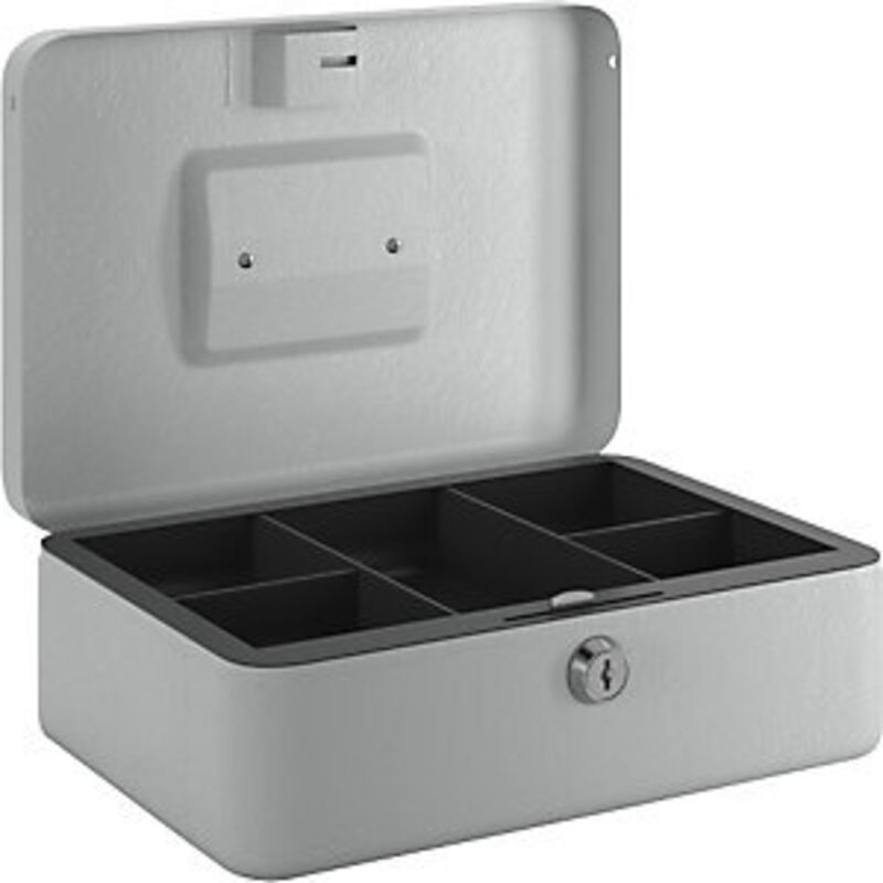 Cassetta portadenaro, inserto in plastica con cinque scomparti per monete, alt. x largh. x prof. 90 x 255 x 180 mm, grigio chiaro. Fornitura = montato. Altezza = 90 mm. Larghezza = 255 mm. Profondità = 180 mm. Serratura = serratura a cilindro di sicurezza con 2 chiavi. Colore = grigio chiaro. Materiale = lamiera d'acciaio, verniciata a polvere. Modello cassettine = 5 scomparti per monete. Tipo di prodotto = cassette portadenaro. Per custodire in modo sicuro contanti, ricevute e altri oggetti di valore. Con pratica maniglia per il trasporto (incassata nel coperchio). Tutte le cassette portadenaro con serratura a cilindro di sicurezza e 2 chiavi.