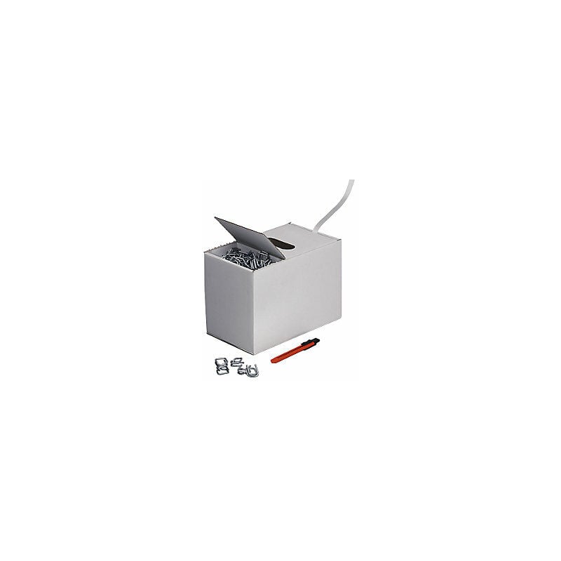 Set per reggiatura, reggia resistente in PET incollata, reggia in dispenser di cartone, ganci metallici, taglierina, larghezza reggia 13 mm. Fornitura = montato. Materiale reggia = reggia resistente in PET, incollata. Fornitura = dispenser in cartone, ganci metallici, taglierina. Larghezza reggia = 13 mm. Campo d'applicazione = prodotti pesanti, prodotti fragili, prodotti ingombranti. Durata di impiego = stoccaggio a lungo termine. Luogo d'impiego = per interni ed esterni. Resistenza alla trazione = 375 kg. Chiusura = ganci metallici. Lunghezza reggia = 250 m. Versione svolgitore = dispenser in cartone con nastro. Tipo di prodotto = set per reggiatura. Il set è composto da - 1 bobina di reggia resistente in poliestere, incollata, in dispenser di cartone - Ganci metallici, confezione da 100 pezzi da 13 mm o 80 pezzi da 16 mm - 1 taglierina Tutti i componenti sono disponibili singolarmente per ordini successivi. Su richiesta reggia resistente in PET per carichi pesanti. Reggia