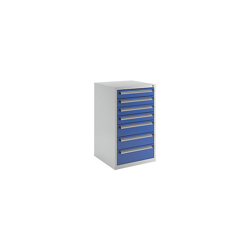Armadietto portattrezzi, larghezza 600 mm, altezza 1000 mm, cassetti 4 x 100, 2 x 150, 1 x 200 mm. Fornitura = montato. Altezza = 1000 mm. Larghezza = 600 mm. Profondità = 600 mm. Portata per cassetto = 35 kg. Numero cassetti = 7 pz. Altezza cassetti = 4x100, 2x150, 1x200 mm. Estrazione cassetti = 100%. Colore corpo = grigio chiaro RAL 7035. Colore frontalino = blu genziana RAL 5010. Materiale = acciaio, verniciato a polvere. Versione cassetti = con guide telescopiche su cuscinetti a sfera. Serratura = chiusura centralizzata a cilindro. Caratteristiche = possibilità di applicare targhette. Ottimo rapporto qualità/prezzo. Cassetti su scorrevoli guide telescopiche (estraibili al 100%). Maniglie a listello in alluminio con portatarghette. Serratura a cilindro con chiusura centralizzata. Robusta struttura in acciaio verniciata a polvere. Corpo in grigio chiaro RAL 7035. Frontalini in blu genziana RAL 5010. Cassetti estraibili al 100% su scorrevoli guide telescopiche, per avere a