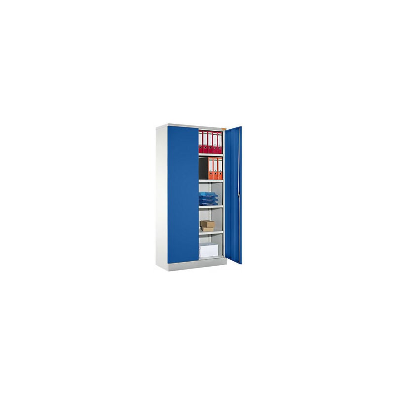 Armadio universale, alt. x largh. x prof. 1950 x 915 x 421 mm, grigio chiaro / blu genziana. Fornitura = smontato. Larghezza = 915 mm. Altezza = 1950 mm. Profondità = 421 mm. Colore corpo = grigio chiaro RAL 7035. Materiale = lamiera d'acciaio, verniciata a polvere. Tipo di prodotto = armadi con ante a battente. Tipo di porta = anta a battente. Colore porta = blu genziana RAL 5010. Numero ante = 2 pz. Numero ripiani = 4 pz. Materiale ripiani = lamiera d'acciaio, laccata. Colore ripiani = grigio chiaro RAL 7035. Portata per ripiano = 50 kg. Caratteristiche = con serratura. Serratura = serratura a cilindro girevole con chiusura a doppio chiavistello, 2 chiavi incluse. Numero file raccoglitori = 5 pz. Dotazione interna = 4 ripiani. Passo di regolazione altezza ripiani = 46 mm. Altezza zoccolo = 100 mm. Angolo di apertura delle porte = 110 °. Spessore ripiani = 0.70 mm. Spessore del corpo = 0.70 mm. Spessore porta = 0.70 mm. Armadi versatili con un eccezionale rapporto qualità-prezzo. Con