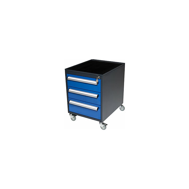 Cassettiera con rotelle, per tavoli da lavoro modulari WT, 3 cassetti (150/150/180 mm). Fornitura = in parte smontato. Altezza = 490 mm. Larghezza = 600 mm. Profondità = 690 mm. Colore corpo = antracite. Colore frontalino = blu genziana. Dotazione = 3 cassetti (150/150/180 mm). Dotazione ruote = 4 rotelle pivottanti, di cui 2 con fermi. Ausilio mobile per l'officina con 4 rotelle pivottanti. A scelta con 3 o 4 cassetti. Cassettiera mobile con rotelle in acciaio verniciato a polvere antracite/blu genziana RAL 5010. Con bordino anticaduta e stuoia in gomma. Maniglia in alluminio. Altezza x larghezza x profondità 490 x 600 x 690 mm. 4 rotelle pivottanti, 2 con fermi. Chiusura centralizzata.