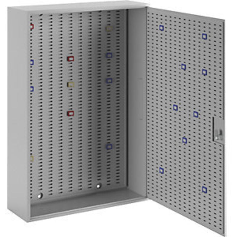 Armadietto portachiavi, grigio chiaro RAL 7035, alt. x largh. x prof. 550 x 380 x 130 mm, per 90 ganci. Fornitura = montato. Numero ganci = 90 pz. Profondità = 130 mm. Larghezza = 380 mm. Altezza = 550 mm. Peso = 8 kg. Serratura = serratura a cilindro con 2 chiavi. Numero ganci max = 90 pz. Numero fori = 4 pz. Numero ante = 1 pz. Colore = grigio chiaro RAL 7035. Tipo di prodotto = armadietti portachiavi. Ganci per chiavi collocabili in modo personalizzato. Con quattro fori nella parete posteriore, Ø 6 mm, per il fissaggio a muro o all'interno di un mobile. Verniciatura in grigio chiaro RAL 7035. Corpo a parete singola con frontalino piatto e anta con battuta a filo. Bordino su tutti i lati. Serratura a cilindro di serie, 2 chiavi incluse. I ganci e le targhette portachiavi devono essere ordinati separatamente.