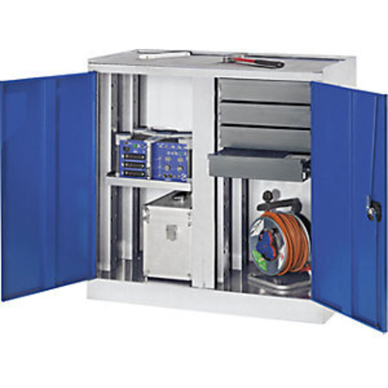 L'armadietto portattrezzi e di servizio è l'alleato perfetto per tenere in ordine e sempre a portata di mano attrezzi e utensili. Con 4 cassetti e 1 ripiano regolabile in altezza, offre spazio sufficiente per organizzare tutti gli strumenti necessari. Realizzato in resistente acciaio con superficie verniciata a polvere, garantisce durata nel tempo. I cassetti e i ripiani estraibili su guide telescopiche facilitano l'accesso e l'utilizzo degli oggetti, mentre il piano d'appoggio con bordino anticaduta assicura la sicurezza durante il lavoro. Con una portata massima di 30 kg per ripiano, è ideale per ogni tipo di attrezzatura. Completo di parete divisoria e ante blu genziana che donano un tocco di stile al tuo ambiente. Pratico, funzionale e di alta qualità, questo armadietto ti permetterà di organizzare al meglio il tuo spazio di lavoro e rendere più efficienti le tue attività. Un prodotto indispensabile per chi vuole avere tutto sotto controllo in modo comodo e sicuro.
