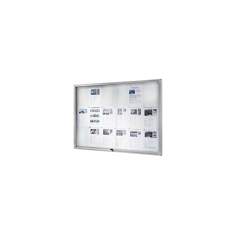 Bacheca, cornice in alluminio, ante scorrevoli, 21 x UNI A4, difficilmente infiammabile, largh. x alt. x prof. 1540 x 970 x 50 mm. Fornitura = montato. Capacità fogli UNI A4 = 21 (3x7) pz. Versione = difficilmente infiammabile B1. Altezza esterna = 970 mm. Larghezza esterna = 1540 mm. Profondità esterna = 50 mm. Profondità interna = 24 mm. Altezza superficie utile = 900 mm. Larghezza superficie utile = 1470 mm. Versione bacheche = magnetiche. Materiale del vetro = vetro temprato di sicurezza monolastra. Spessore del vetro = 5 mm. Materiale cornice/telaio = alluminio, anodizzato. Colore cornice = argento. Materiale parete posteriore = metallo, verniciatura a polvere. Colore parete posteriore = bianco puro RAL 9010. Tipo di porta = porta scorrevole. Serratura = serratura a cilindro di sicurezza con 2 chiavi. Peso = 37.4 kg. Cornice = con spigoli arrotondati. Protezione dei materiali esposti dalla polvere e dai furti. L'assenza di porte o ante con apertura verso l'esterno le rende ideali