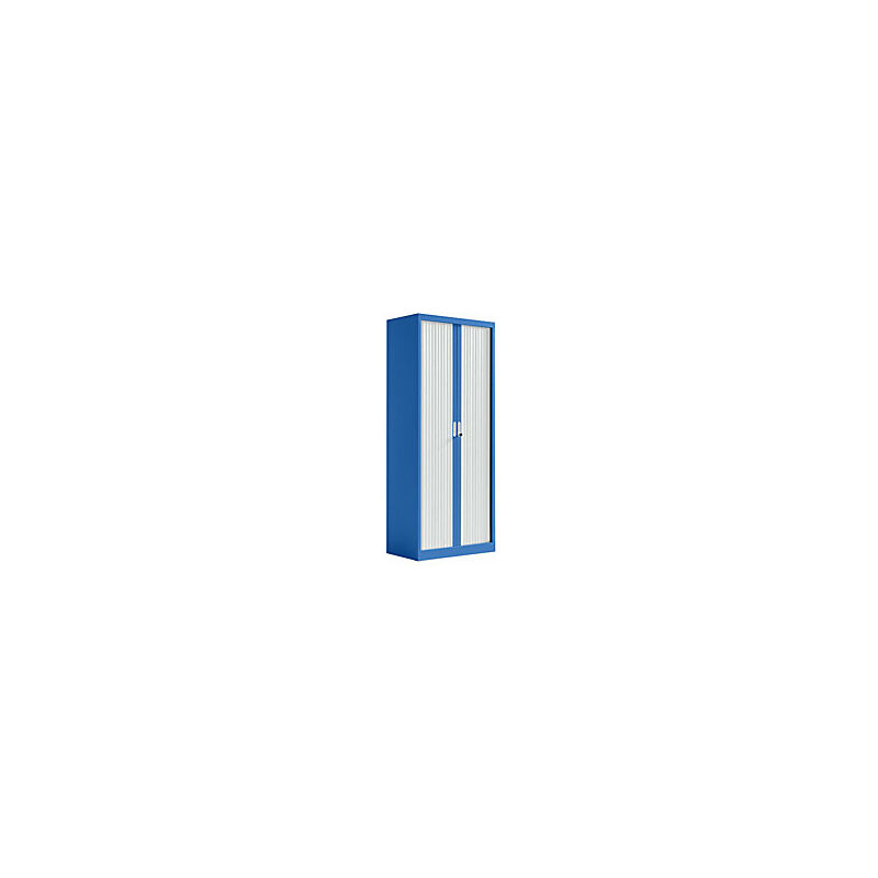 Armadio a serranda, largh. x prof. 800 x 450 mm, altezza 1950 mm, blu genziana. Fornitura = montato. Altezza = 1970 mm. Larghezza = 800 mm. Profondità = 450 mm. Colore corpo = blu genziana RAL 5010. Materiale corpo = lamiera d'acciaio. Colore serranda = grigio chiaro. Caratteristiche = con serratura. Serratura = serratura a cilindro con 2 chiavi. Numero file raccoglitori = 5 pz. Materiale serranda = plastica. Dotazione interna = 4 ripiani. Numero ripiani = 4 pz. Portata per ripiano = 45 kg. Colore ripiani = grigio chiaro. Tipo di porta = serrande. Passo di regolazione altezza ripiani = 19 mm. Larghezza interna = 646 mm. Altezza interna = 1945 mm. Profondità interna = 378 mm. Spessore ripiani = 0.9 mm. Spessore del corpo = 0.7 mm. Altezza zoccolo = 80 mm. Serrande orizzontali, con serratura. Ripiani regolabili in altezza. Quattro piedini a vite regolabili. Pregiato armadio a serranda in lamiera d'acciaio spessa 0,7 mm, verniciatura a polvere strutturata. Le serrande abbassabili in