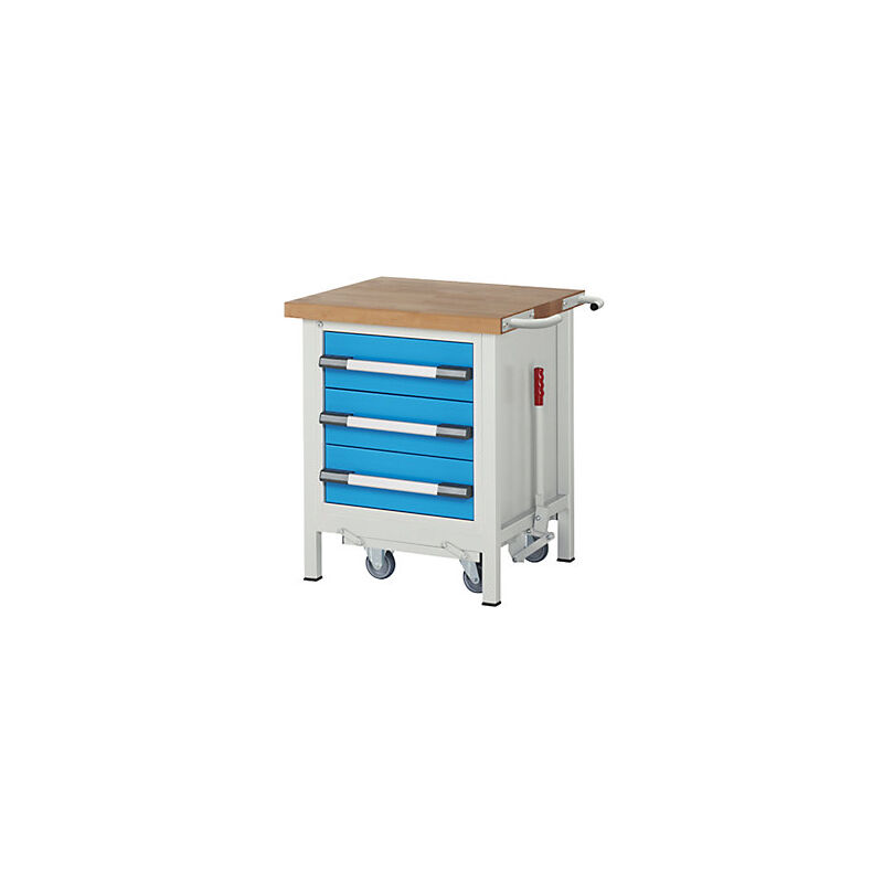 Banco da lavoro mobile abbassabile, struttura a telaio Serie 8000, 3 cassetti, ripiano, largh. x prof. 750 x 700 mm. Fornitura = montato. Larghezza piano = 750 mm. Profondità piano = 700 mm. Tipo di piano = piano in faggio massello. Spessore piano = 40 mm. Numero cassetti = 3 pz. Altezza cassetti = 1x180 mm. Altezza = 880 mm. Colore frontalino = blu chiaro RAL 5012. Versione cassetti = guida telescopica su cuscinetti a sfera. Portata per cassetto = 100 kg. Estrazione cassetti = 90%. Larghezza cassetti = 490 mm. Profondità cassetti = 560 mm. Materiale telaio = acciaio, verniciato a polvere. Portata statica = 450 kg. Versione telaio = tubo quadro 45x45 mm con telaio abbassabile. Colore telaio = grigio chiaro RAL 7035. Serratura = chiusura centralizzata a cilindro. Numero ripiani = 1 pz. Mobili grazie a 2 rotelle pivottanti e 2 rotelle a supporto fisso - stabili grazie al telaio abbassabile. Con telaio estensibile (leva ad eccentrico). Da fisso portata fino a 1250 kg. Facile spostamento