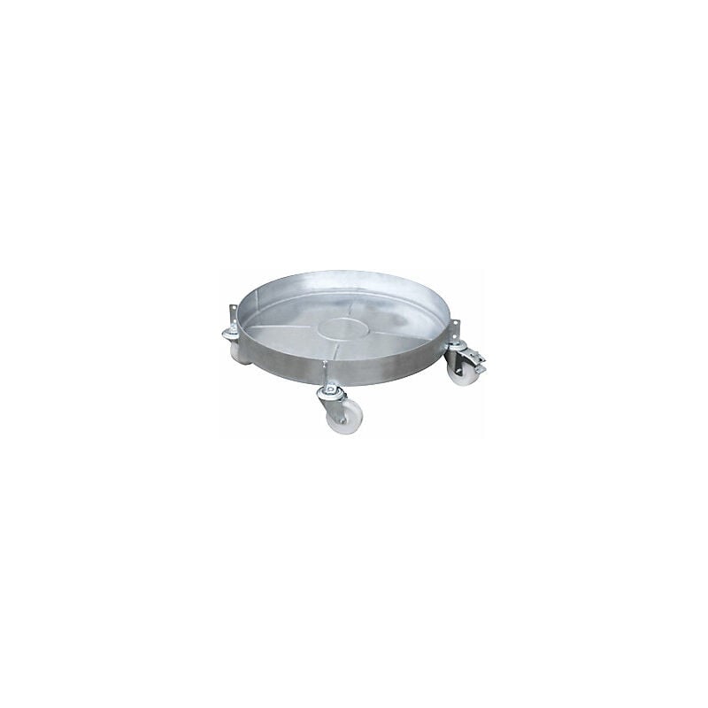 Carrellino per fusto, zincato, con vasca, fusti fino a Ø 600 mm, altezza di carico 209 mm. Fornitura = montato. Portata = 300 kg. Materiale = acciaio, zincato a fuoco. Diametro interno telaio = 600 mm. Altezza di carico = 209 mm. Dotazione ruote = 4 rotelle pivottanti di cui 1 con fermi. Diametro rotelle pivottanti = 100 mm. Versione ruote = poliammide. Cuscinetti ruota = cuscinetto a strisciamento. Per fusti con capacità = 200 litri. Tipo di prodotto = carrellini per fusti. Con vasca a tenuta d'olio. Zincatura di lunga durata. Trasporto fusti semplice e sicuro. Carrello in lamiera d'acciaio per fusti con Ø 600 mm. 4 rotelle pivottanti in poliammide.