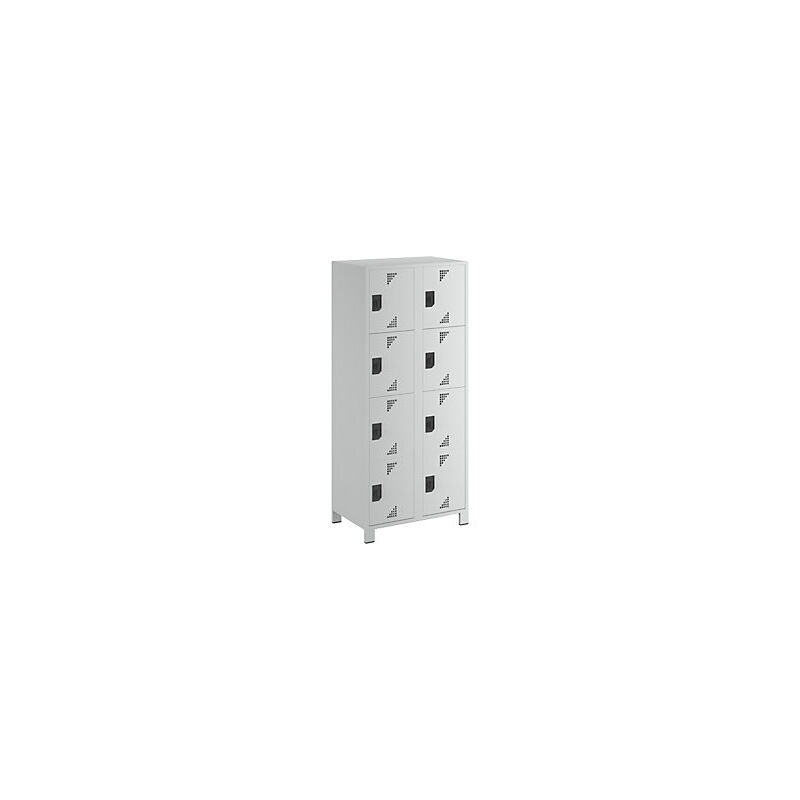 Armadietto a scomparti, altezza scomparto 418 mm, alt. x largh. x prof. 1800 x 800 x 500 mm, 8 scomparti, completamente in grigio chiaro. Fornitura = montato. Altezza = 1800 mm. Profondità = 500 mm. Larghezza = 800 mm. Colore corpo = grigio chiaro RAL 7035. Colore porta = grigio chiaro RAL 7035. Serratura = chiavistello girevole di sicurezza per lucchetto. Numero scomparti in larghezza = 8 pz. Larghezza scomparti = 400 mm. Materiale = lamiera d'acciaio, saldata a punti. Altezza armadietto = 418 mm. Dotazione interna = senza accessori. Tipo di porta = anta a battente. Struttura = saldata a punti. Superficie = con verniciatura a forno. Finecorsa di apertura integrato. Da chiusa, la serratura può essere ruotata di 360°, contro i tentativi di apertura forzata. Piedini zincati - regolabili in altezza fino a 10 mm. Aerazione mediante fori sulle ante e sulla parete posteriore. Robusta struttura in lamiera d'acciaio saldata a punti, verniciatura a fuoco. Corpo sempre in grigio chiaro RAL 7035.