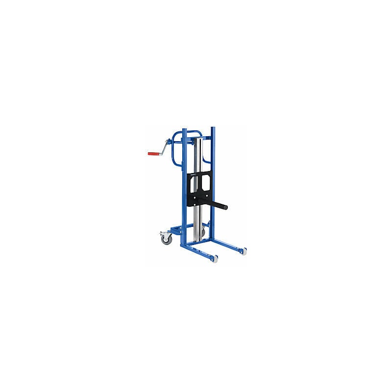 Carrello elevatore per materiali, con braccio, con rulli forche. Fornitura = in parte smontato. Versione = braccio / rotelle a supporto fisso. Elemento di attacco lungh. x largh./Ø = 600x42 mm. Portata = 120 kg. Baricentro del carico = 300 mm. Range di sollevamento = 120 - 985 mm. Lunghezza totale = 970 mm. Larghezza totale = 506 mm. Altezza totale = 1265 mm. Altezza entrate forche = 75 mm. Materiale = acciaio. Caratteristiche = manuale. Superficie = verniciatura a polvere. Colore = blu segnaletico RAL 5005. Sollevamento carico intercambiabile. A scelta con rotelle a supporto fisso oppure a guida quadridirezionale. Ruote sterzanti con fermi. Carrello elevatore per materiali con differenti strumenti di sollevamento carichi per diversi impieghi. Baricentro del carico 300 mm. Per portare materiali o attrezzi da lavoro all'altezza ideale. Spostabile su 2 rotelle pivottanti con fermi e 2 rulli forche o con guida quadridirezionale. Sollevamento tramite verricello di sicurezza autobloccante e