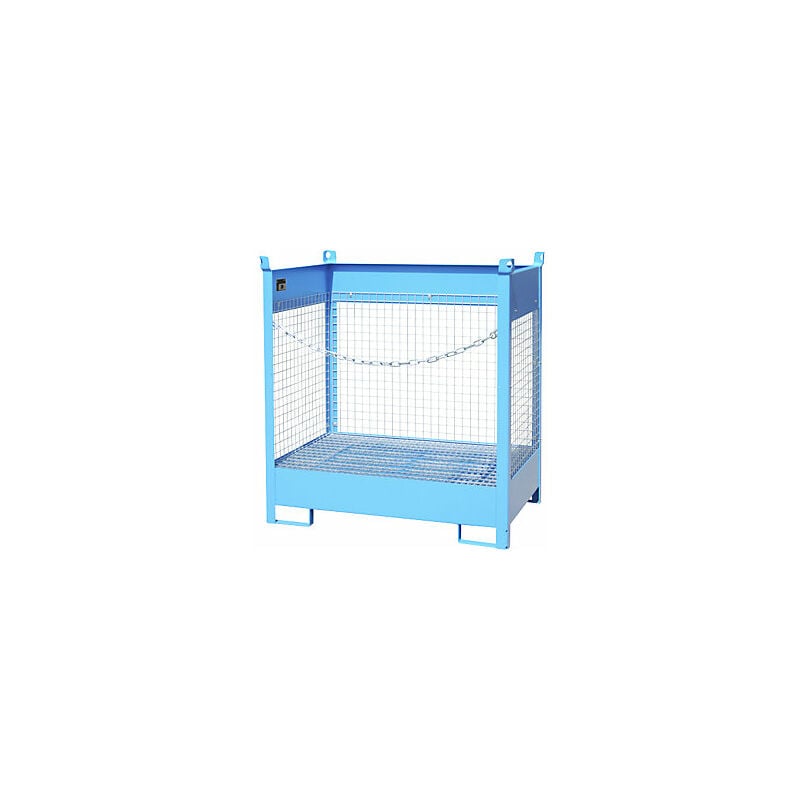 Palette con vasca di raccolta per trasporto e magazzinaggio, 3 pareti a griglia, per 2 fusti da 200 l, blu. Fornitura = montato. Versione griglia = con griglia zincata. Capacità fusti = 2x200 l. Capacità di raccolta = 210 l. Lunghezza = 910 mm. Larghezza = 1400 mm. Altezza = 1495 mm. Materiale = lamiera d'acciaio. Superficie = verniciatura. Colore = blu chiaro RAL 5012. Portata = 1000 kg/m². Altezza entrate forche = 100 mm. Marchio di collaudo = ÜHP secondo la direttiva StawaR. Spessore materiale = 3 mm. Per sostanze = liquidi infiammabili e inquinanti per le acque. Classi di pericolosità = per liquidi infiammabili delle categorie GHS 1 - 3 e per liquidi inquinanti per le acque delle categorie GHS 1 - 4. Caratteristiche = impilabile. Carico impilabile = 1824 kg. Pareti a griglia su 3 lati per proteggere il carico. Per il trasporto e il magazzinaggio a norma di legge di fusti per sostanze pericolose. Salvaspazio - Impilabili a gruppi di 3. Movimentazione ottimale grazie a occhielli per