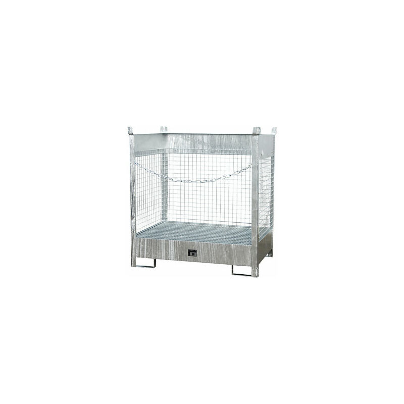 Palette con vasca di raccolta per trasporto e magazzinaggio, 3 pareti a griglia, per 2 fusti da 200 l, zincati. Fornitura = montato. Versione griglia = con griglia zincata. Capacità fusti = 2x200 l. Capacità di raccolta = 210 l. Lunghezza = 910 mm. Larghezza = 1400 mm. Altezza = 1495 mm. Materiale = lamiera d'acciaio. Superficie = zincatura a fuoco. Colore = zincatura a fuoco. Portata = 1000 kg/m². Altezza entrate forche = 100 mm. Marchio di collaudo = ÜHP secondo la direttiva StawaR. Spessore materiale = 3 mm. Per sostanze = liquidi infiammabili e inquinanti per le acque. Classi di pericolosità = per liquidi infiammabili delle categorie GHS 1 - 3 e per liquidi inquinanti per le acque delle categorie GHS 1 - 4. Caratteristiche = impilabile. Carico impilabile = 1824 kg. Pareti a griglia su 3 lati per proteggere il carico. Per il trasporto e il magazzinaggio a norma di legge di fusti per sostanze pericolose. Salvaspazio - Impilabili a gruppi di 3. Movimentazione ottimale grazie a