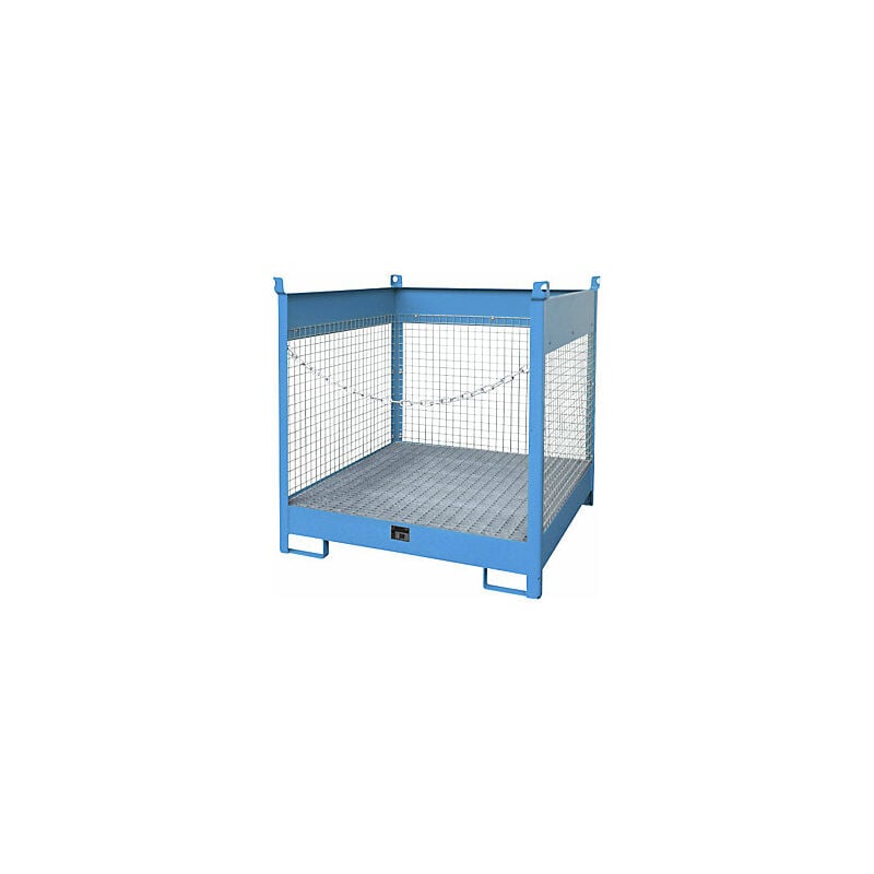 Palette con vasca di raccolta per trasporto e magazzinaggio, 3 pareti a griglia, per 4 fusti da 200 l, blu. Fornitura = montato. Versione griglia = con griglia zincata. Capacità fusti = 4x200 l. Capacità di raccolta = 220 l. Lunghezza = 1400 mm. Larghezza = 1410 mm. Altezza = 1435 mm. Materiale = lamiera d'acciaio. Superficie = verniciatura. Colore = blu chiaro RAL 5012. Portata = 1000 kg/m². Altezza entrate forche = 100 mm. Marchio di collaudo = ÜHP secondo la direttiva StawaR. Spessore materiale = 3 mm. Per sostanze = liquidi infiammabili e inquinanti per le acque. Classi di pericolosità = per liquidi infiammabili delle categorie GHS 1 - 3 e per liquidi inquinanti per le acque delle categorie GHS 1 - 4. Caratteristiche = impilabile. Carico impilabile = 3424 kg. Pareti a griglia su 3 lati per proteggere il carico. Per il trasporto e il magazzinaggio a norma di legge di fusti per sostanze pericolose. Salvaspazio - Impilabili a gruppi di 3. Movimentazione ottimale grazie a occhielli per
