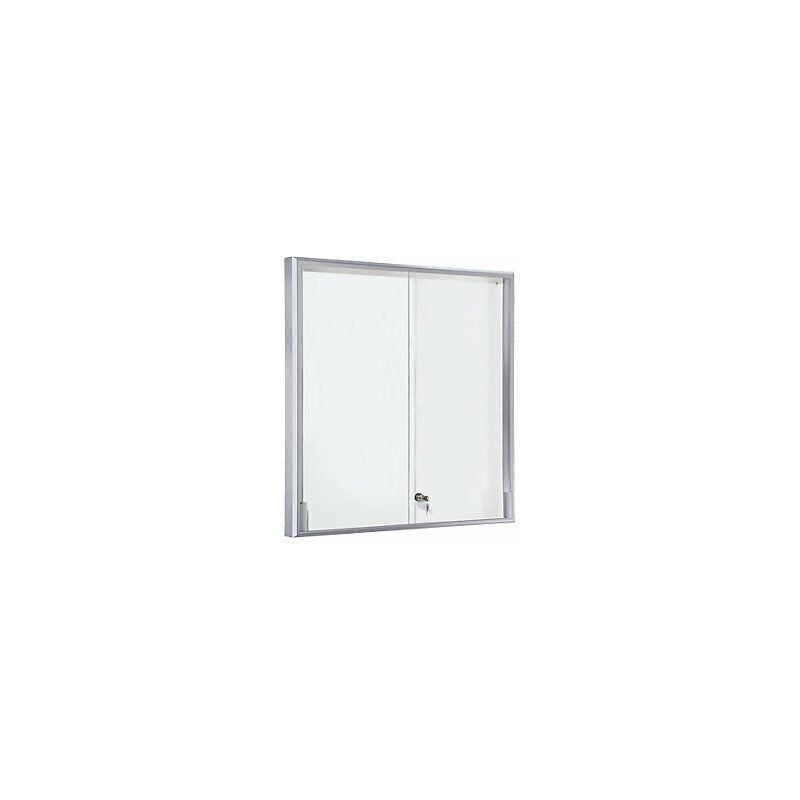 Bacheca, cornice in alluminio, ante scorrevoli, 12 x UNI A4, lungh. x alt. x prof. 910 x 970 x 50 mm, telaio con spigoli. Fornitura = montato. Capacità fogli UNI A4 = 12 (3x4) pz. Altezza esterna = 970 mm. Larghezza esterna = 910 mm. Profondità esterna = 50 mm. Profondità interna = 24 mm. Altezza superficie utile = 900 mm. Larghezza superficie utile = 840 mm. Versione bacheche = magnetiche. Materiale del vetro = vetro temprato di sicurezza monolastra. Spessore del vetro = 4 mm. Materiale cornice/telaio = alluminio, anodizzato. Colore cornice = argento. Materiale parete posteriore = metallo, verniciatura a polvere. Colore parete posteriore = bianco puro RAL 9010. Tipo di porta = porta scorrevole. Serratura = serratura a cilindro di sicurezza con 2 chiavi. Peso = 20 kg. Cornice = con spigoli vivi. Protezione dei materiali esposti dalla polvere e dai furti. L'assenza di porte o ante con apertura verso l'esterno le rende ideali per gli spazi ridotti. Ante in vetro temprato di sicurezza