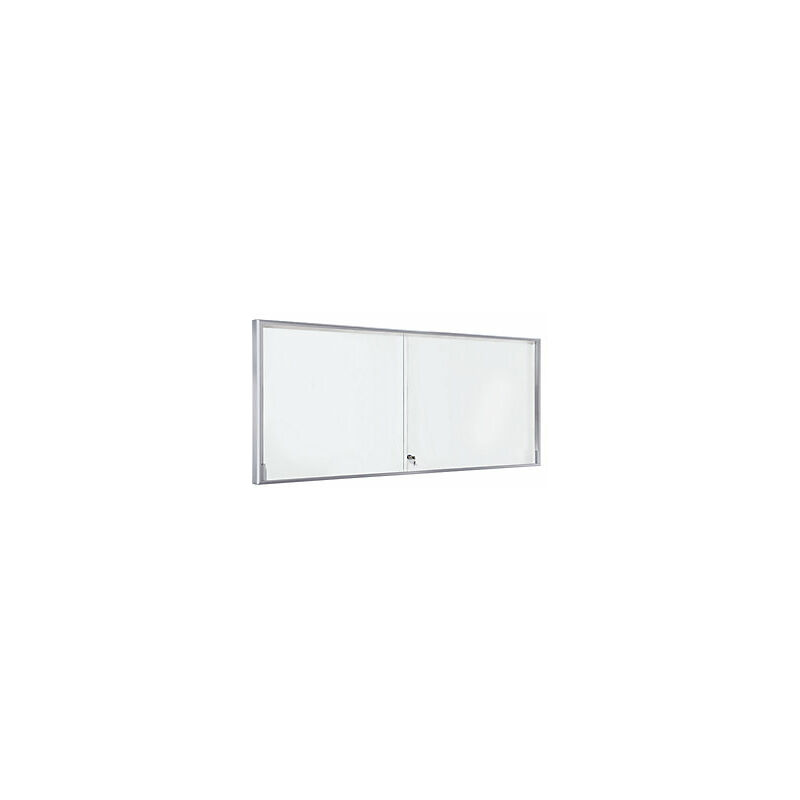 Bacheca, cornice in alluminio, ante scorrevoli, 27 x UNI A4, lungh. x alt. x prof. 1970 x 970 x 50 mm, telaio con spigoli. Fornitura = montato. Capacità fogli UNI A4 = 27 (3x9) pz. Altezza esterna = 970 mm. Larghezza esterna = 1970 mm. Profondità esterna = 50 mm. Profondità interna = 24 mm. Altezza superficie utile = 900 mm. Larghezza superficie utile = 1890 mm. Versione bacheche = magnetiche. Materiale del vetro = vetro temprato di sicurezza monolastra. Spessore del vetro = 4 mm. Materiale cornice/telaio = alluminio, anodizzato. Colore cornice = argento. Materiale parete posteriore = metallo, verniciatura a polvere. Colore parete posteriore = bianco puro RAL 9010. Tipo di porta = porta scorrevole. Serratura = serratura a cilindro di sicurezza con 2 chiavi. Peso = 42 kg. Cornice = con spigoli vivi. Protezione dei materiali esposti dalla polvere e dai furti. L'assenza di porte o ante con apertura verso l'esterno le rende ideali per gli spazi ridotti. Ante in vetro temprato di sicurezza