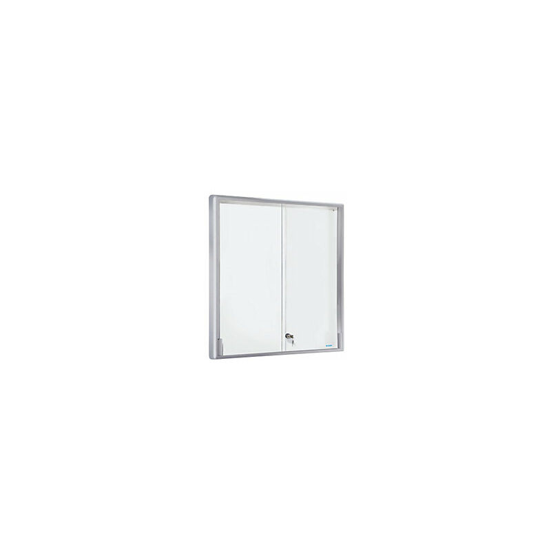 Bacheca, cornice in alluminio, ante scorrevoli, 12 x UNI A4, lungh. x alt. x prof. 910 x 970 x 50 mm, telaio con spigoli arrotondati. Fornitura = montato. Capacità fogli UNI A4 = 12 (3x4) pz. Altezza esterna = 970 mm. Larghezza esterna = 910 mm. Profondità esterna = 50 mm. Profondità interna = 24 mm. Altezza superficie utile = 900 mm. Larghezza superficie utile = 840 mm. Versione bacheche = magnetiche. Materiale del vetro = vetro temprato di sicurezza monolastra. Spessore del vetro = 4 mm. Materiale cornice/telaio = alluminio, anodizzato. Colore cornice = argento. Materiale parete posteriore = metallo, verniciatura a polvere. Colore parete posteriore = bianco puro RAL 9010. Tipo di porta = porta scorrevole. Serratura = serratura a cilindro di sicurezza con 2 chiavi. Peso = 20 kg. Cornice = con spigoli arrotondati. Protezione dei materiali esposti dalla polvere e dai furti. L'assenza di porte o ante con apertura verso l'esterno le rende ideali per gli spazi ridotti. Ante in vetro