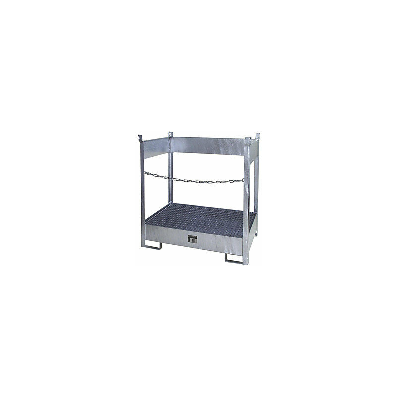 Palette con vasca di raccolta per trasporto e magazzinaggio, aperte su tutti i lati, impilabili, per 2 fusti, con zincatura. Fornitura = montato. Versione griglia = con griglia zincata. Capacità fusti = 2x200 l. Capacità di raccolta = 210 l. Lunghezza = 910 mm. Larghezza = 1400 mm. Altezza = 1495 mm. Materiale = lamiera d'acciaio. Superficie = zincatura a fuoco. Colore = zincatura a fuoco. Portata = 1000 kg/m². Altezza entrate forche = 100 mm. Marchio di collaudo = ÜHP secondo la direttiva StawaR. Spessore materiale = 3 mm. Per sostanze = liquidi infiammabili e inquinanti per le acque. Classi di pericolosità = per liquidi infiammabili delle categorie GHS 1 - 3 e per liquidi inquinanti per le acque delle categorie GHS 1 - 4. Caratteristiche = impilabile. Carico impilabile = 1786 kg. Tutti i 4 lati aperti. Per il trasporto e il magazzinaggio a norma di legge di fusti per sostanze pericolose. Salvaspazio - Impilabili a gruppi di 3. Movimentazione ottimale grazie a occhielli per