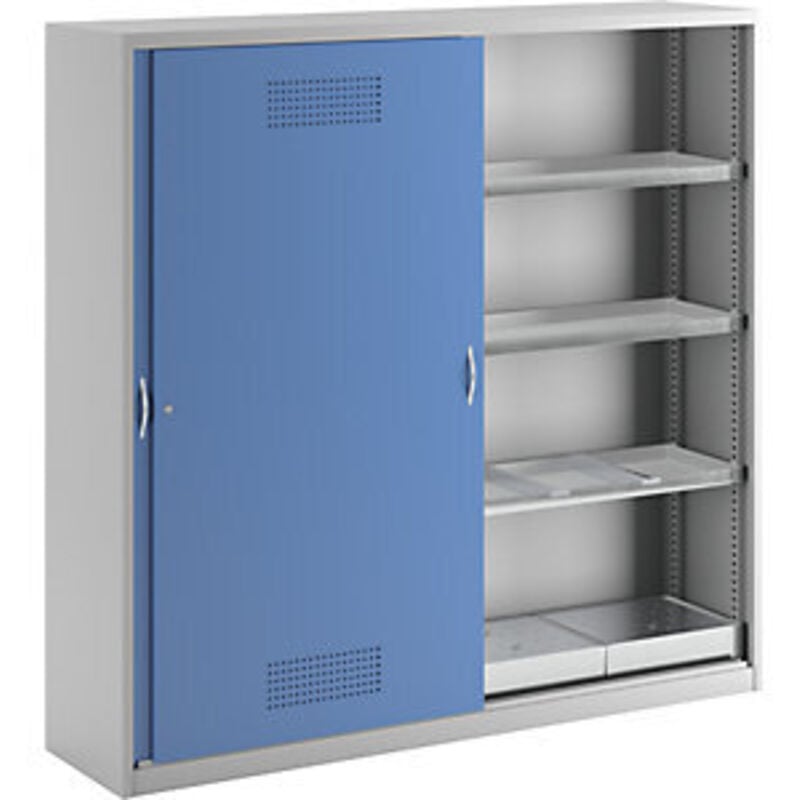 Armadio ecologico, armadio con ante scorrevoli XL, 6 ripiani a vasca, alt. x largh. x prof. 1950 x 2000 x 500 mm. Fornitura = montato. Altezza = 1950 mm. Larghezza = 2000 mm. Profondità = 500 mm. Materiale = lamiera d'acciaio. Colore corpo = grigio chiaro RAL 7035. Colore porta = blu chiaro RAL 5012. Numero ante = 2 pz. Tipo di porta = porta scorrevole. Portata per ripiano = 65 kg. Serratura = serratura a cilindro. Superficie = verniciatura a polvere. Numero di ripiani a vasca = 6 pz. Capacità dei ripiani a vasca = 20 l. Numero di vasche di raccolta = 2 pz. Per il magazzinaggio a norma in piccoli contenitori di liquidi inquinanti per le acque. Ante con serratura e fessure per un efficace ricambio dell'aria. Ripiani a vasca e vasche di raccolta in lamiera d'acciaio spessa 3 mm, con saldatura a tenuta stagna in conformità a StawaR, omologazione ÜHP. Armadi alti predisposti per il collegamento a un impianto o a un sistema di estrazione aria a cura del cliente (DN 75). Robusta struttura in