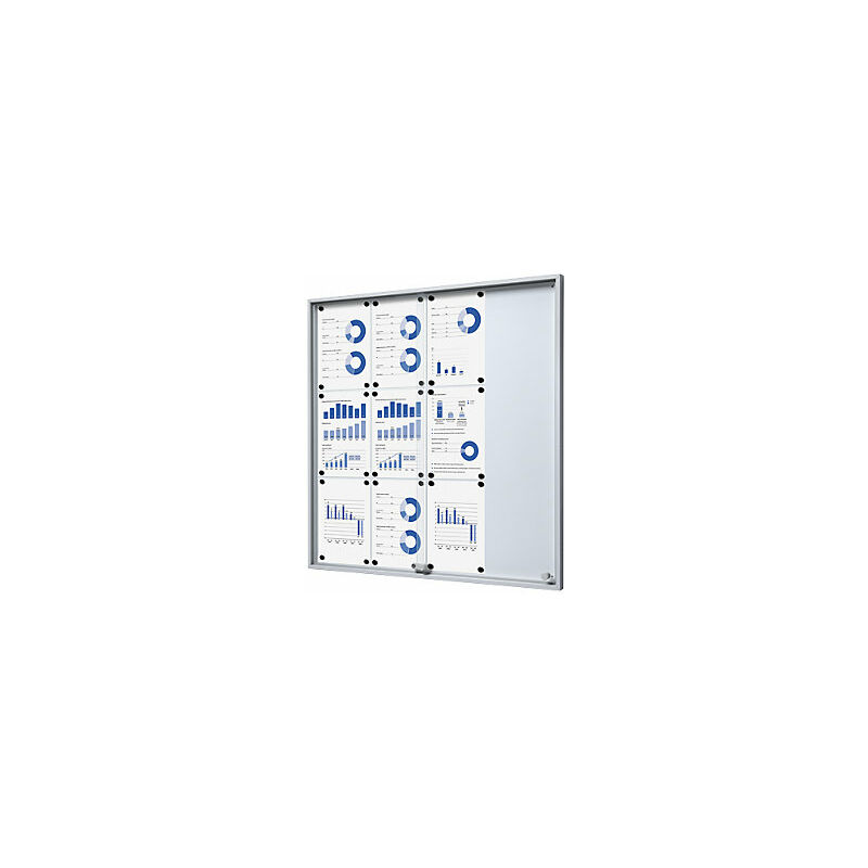 Bacheca con ante scorrevoli, largh. x alt. x prof. esterno 906 x 947 x 50 mm, parete posteriore in metallo. Fornitura = montato. Per formato = UNI A4. Capacità fogli UNI A4 = 12 (3x4) pz. Altezza esterna = 947 mm. Larghezza esterna = 906 mm. Profondità esterna = 50 mm. Profondità interna = 24 mm. Altezza superficie utile = 907 mm. Larghezza superficie utile = 866 mm. Versione bacheche = con parete posteriore in metallo, per magneti. Materiale del vetro = vetro temprato di sicurezza monolastra. Spessore del vetro = 4 mm. Materiale cornice/telaio = alluminio, anodizzato. Colore cornice = alluminio. Materiale parete posteriore = metallo, verniciato. Colore parete posteriore = bianco. Tipo di porta = porta scorrevole. Serratura = serratura a cilindro di sicurezza con 2 chiavi. Peso = 14.48 kg. Luogo d'impiego = per interni. Ideali per spazi ristretti. Classe di protezione antincendio B1 - difficilmente infiammabile . Adatti per edifici pubblici, uffici amministrativi e scuole. Perfetta