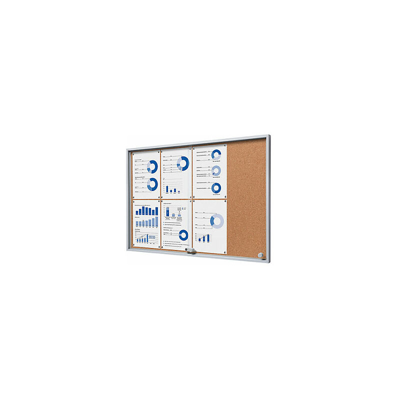 Bacheca con ante scorrevoli, largh. x alt. x prof. esterno 906 x 640 x 50 mm, parete posteriore in sughero. Fornitura = montato. Per formato = UNI A4. Capacità fogli UNI A4 = 8 (2x4) pz. Altezza esterna = 640 mm. Larghezza esterna = 906 mm. Profondità esterna = 50 mm. Profondità interna = 24 mm. Altezza superficie utile = 600 mm. Larghezza superficie utile = 866 mm. Versione bacheche = con parete posteriore in sughero per spilli. Materiale del vetro = vetro temprato di sicurezza monolastra. Spessore del vetro = 4 mm. Materiale cornice/telaio = alluminio, anodizzato. Colore cornice = alluminio. Materiale parete posteriore = sughero. Colore parete posteriore = simil-sughero. Tipo di porta = porta scorrevole. Serratura = serratura a cilindro di sicurezza con 2 chiavi. Peso = 11.55 kg. Luogo d'impiego = per interni. Ideali per spazi ristretti. Classe di protezione antincendio B1 - difficilmente infiammabile . Adatti per edifici pubblici, uffici amministrativi e scuole. Perfetta per spazi