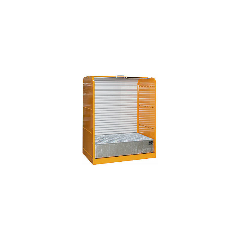 Deposito in acciaio per sostanze pericolose con serranda, per 2 fusti da 200 l, arancione. Fornitura = montato. Altezza esterna = 1610 mm. Larghezza esterna = 1300 mm. Profondità esterna = 870 mm. Capacità fusti = 2x200 l. Capacità di raccolta = 215 l. Colore = arancione RAL 2000. Superficie = verniciatura. Marchio di collaudo = ÜHP secondo la direttiva StawaR. Materiale = acciaio. Serratura = serratura a cilindro. Tipo di porta = serranda orizzontale. Luogo d'impiego = aree interne / aree esterne coperte. Per sostanze = liquidi infiammabili e inquinanti per le acque. Classi di pericolosità = per liquidi infiammabili delle categorie GHS 1 - 3 e per liquidi inquinanti per le acque delle categorie GHS 1 - 4. Peso = 162 kg. Per lo stoccaggio di due fusti da 200 l. Un sistema sicuro per il magazzinaggio a norma di liquidi infiammabili e inquinanti per le acque. Struttura ventilata naturalmente - vasca di raccolta integrata con omologazione ÜHP. Serranda salvaspazio in alluminio con